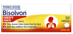 Bisolvon® Chesty Forte Tablets are small and easy to swallow, making them ideal for treating chesty coughs when on the go. The non-drowsy formula means you can take them when you’re working or driving. Delivers proven effectiveness in treating productive, chesty coughs due to common cold, flu or infections of the respiratory tract. Bisolvon® Chesty Forte contains the single active ingredient bromhexine that thins, loosens and clears mucus from the chest to relieve stubborn chest congestion and chesty coughs.