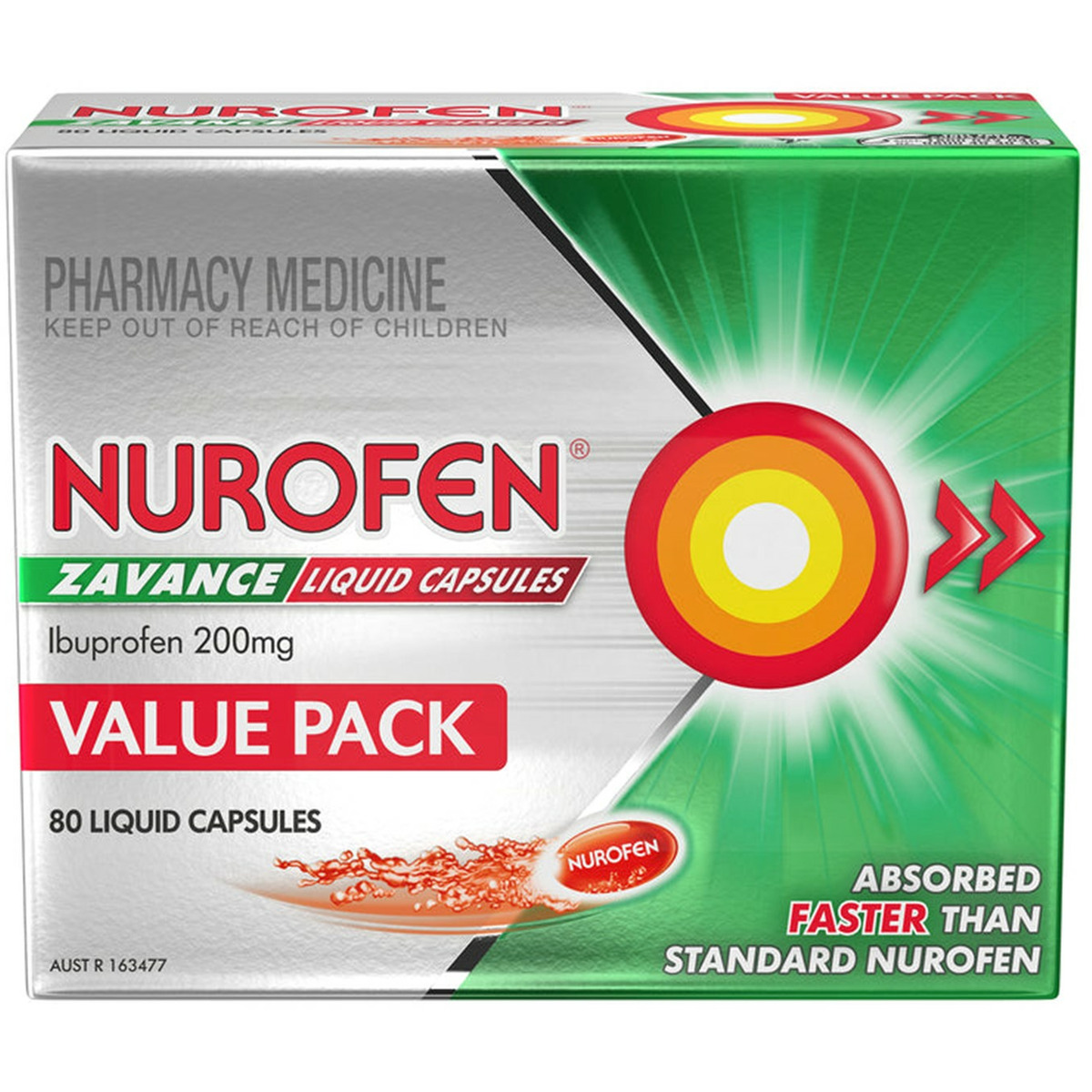 Nurofen Zavance Liquid Capsules (200mg ibuprofen) are absorbed faster than standard Nurofen to provide effective, temporary relief of pain and inflammation associated with headache, tension headache, migraine headache, back pain, dental pain, period pain, muscular pain, cold and flu, arthritic pain, sinus pain. Reduces fever.