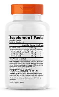 At Doctor's Best, we cherish beauty and flexibility. Our expertly crafted formula contains a patented composition of naturally occurring collagen, chondroitin sulfate, and hyaluronic acid, which work synergistically to support both joint function and skin health, nurturing beauty from the inside out.*