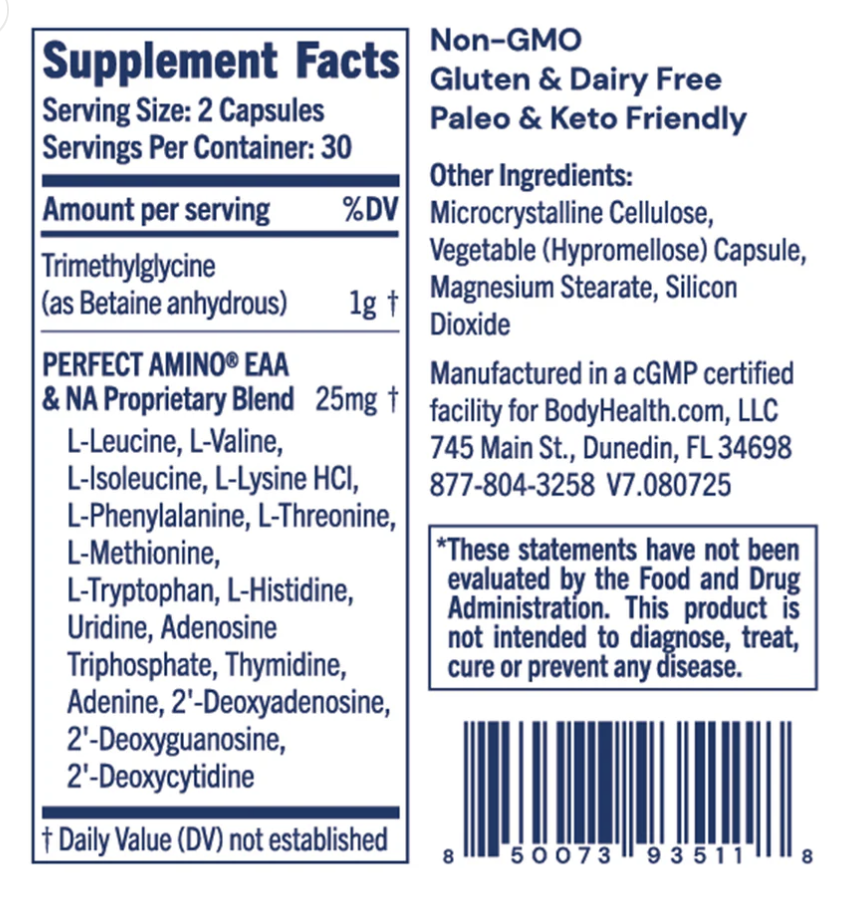 Non-GMO, gluten- and dairy-free, Paleo & Keto friendly, and vegan. Each 2-capsule serving provides 1,000 mg TMG plus PerfectAmino® Essential Amino Acids.