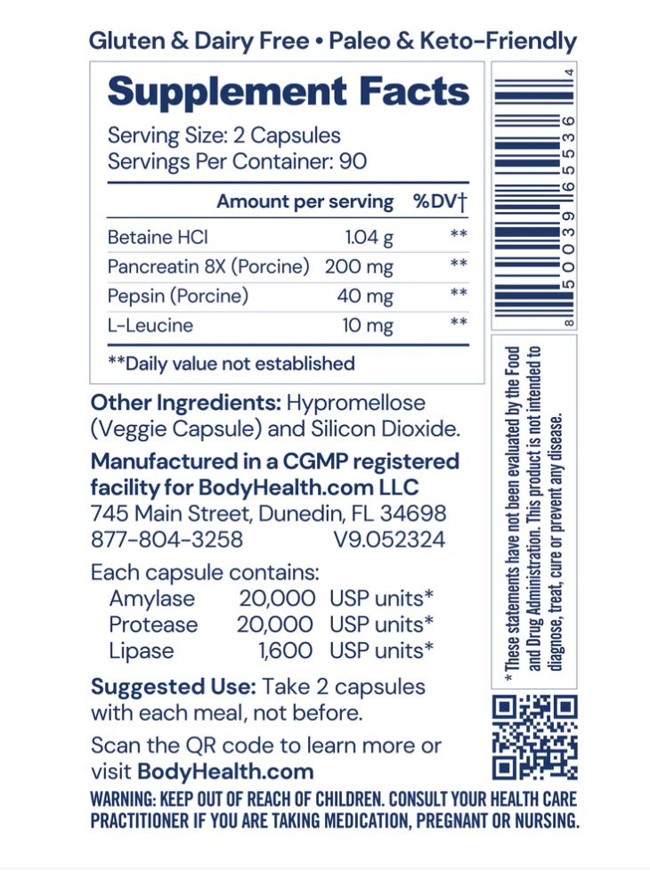 Betaine Hydrochloride: Hydrochloric acid to lower your stomach pH, activate your natural digestive enzymes, and help restore function to the esophageal sphincter.*