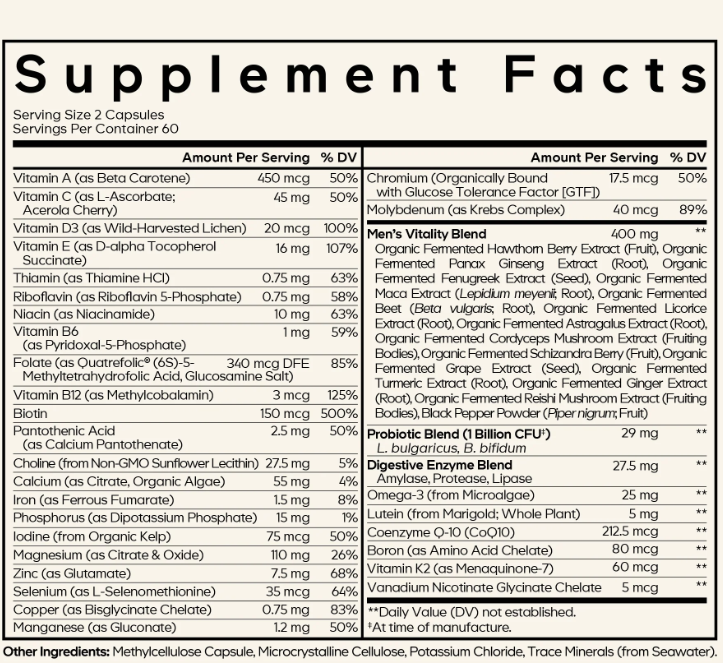 Discover a modern blend of essential vitamins, key minerals, and nutrients. Revel in the enriched formula featuring whole foods, fermented herbs, and a probiotic-enzyme tandem on your journey toward holistic well-being.