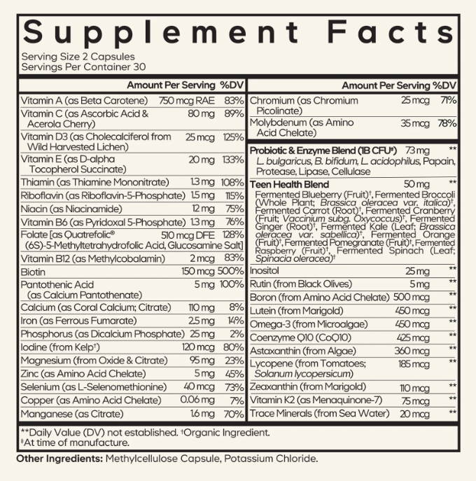 Codeage Teen’s Daily Multivitamin+ is formulated for teenagers aged 12 to 18 and includes over 25 vitamins and minerals, such as vitamins A, B, C, D, E, and K, as well as omega-3, probiotics, and organic whole foods. This product is designed to support the nutritional needs of teens and is suitable for both boys and girls. It is vegan, non-GMO, and free from dairy, soy, and gluten.
