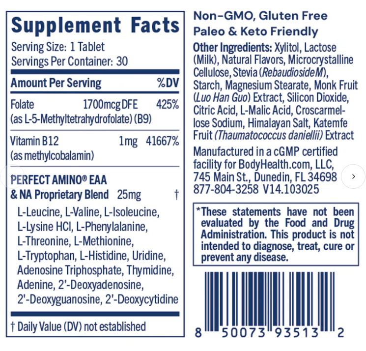 Each dissolvable tablet provides 1,700 mcg methylated folate and 1,000 mcg methylcobalamin with 25 mg PerfectAmino® EAAs.