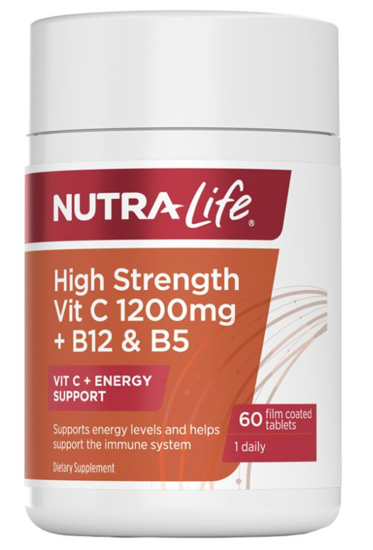 Nutra-Life® High Strength Vit C 1200mg + B12 + B5 combines a high strength 1200mg dose of Vitamin C with Vitamin B12 & Vitamin B5.